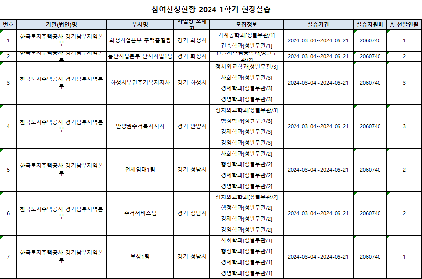 24년 1학기 한국토지주택공사(LH) 경기남부지역본부에서 현장실습생을 모집합니다