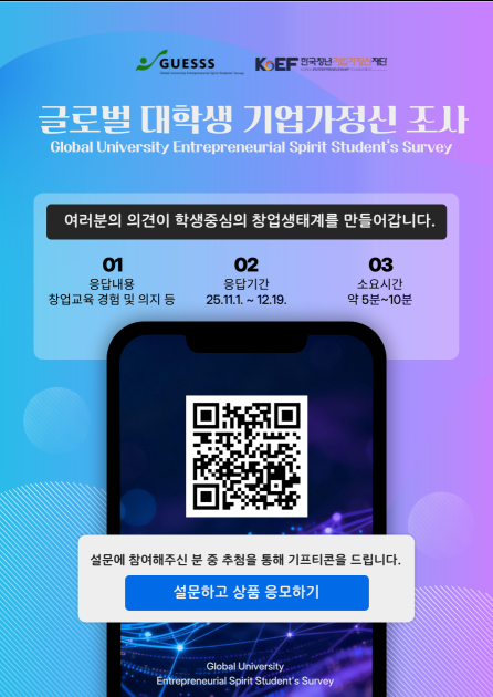 한국청년기업가정신재단에서는 국내 대학(원)생들의 기업가정신 현황 파악 및 국제 비교연구를 위해 『2025 글로벌 대학생 기업가정신 조사(GUESSS)』를 실시하고자 하오니 적극 참여하여 주시기 바랍니다.