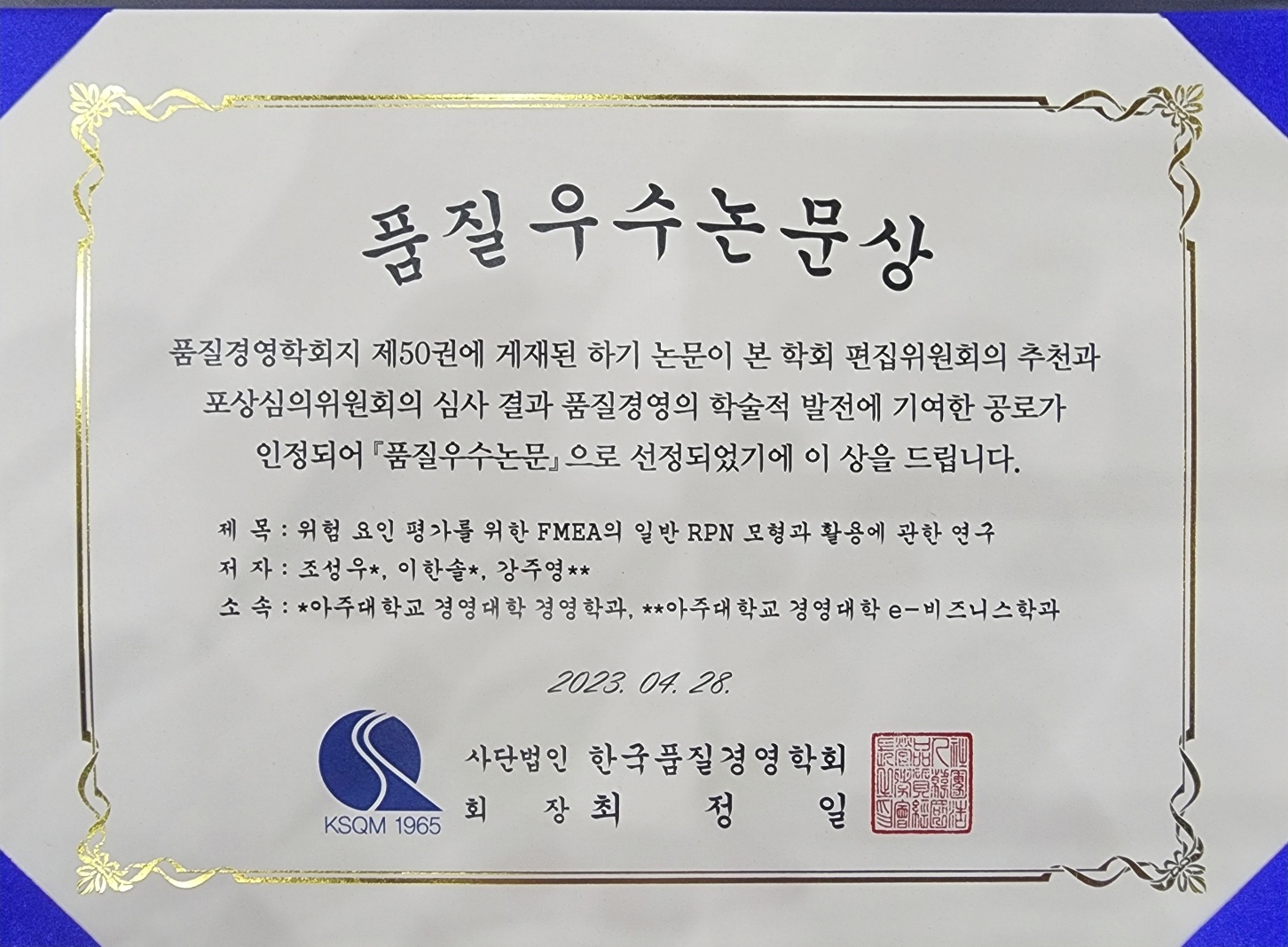 우리 학교 경영학과 박사과정 조성우 연구원과 이한솔 박사(교신저자 강주영 교수)가 한국품질경영학회와 국방기술품질원이 주최한 " K-국방과 글로벌품질강국의 구현 "이라는 주제의 2023년 춘계 학술대회에서 "FMEA를 활용한 위험 요인 평가의 일반 RPN 모형 및 적용 연구"라는 논문으로 품질우수논문상을 수상했다.
