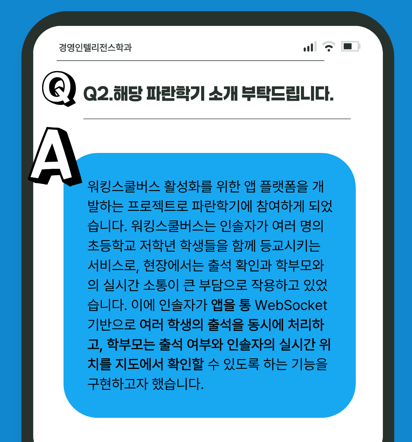 워킹스쿨버스 운영을 디지털로 관리·지원하기 위한 공공서비스 앱 개발 프로젝트로 파란학기에 참가하여 수상한 팀이죠.