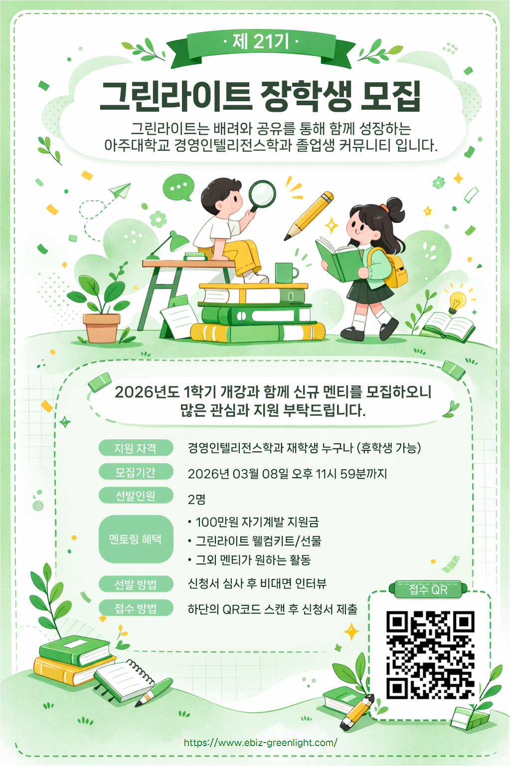 그린라이트 장학회는 e-비즈니스학과 졸업생 선배 총 29명으로 구성되어 있으며 선배님들이 가지신 경험, 노하우를 재학생들에게 공유하고 도움을 주는 장학회입니다.